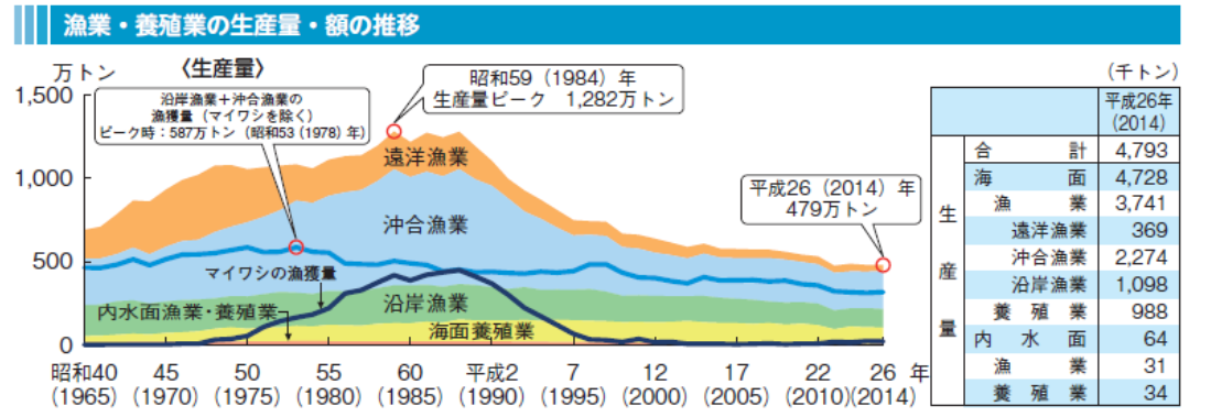 国内の水産生産量(養殖含む)は1984をピークに減少傾向にある。近海で魚が獲れない事態に直面している。